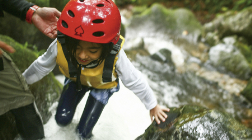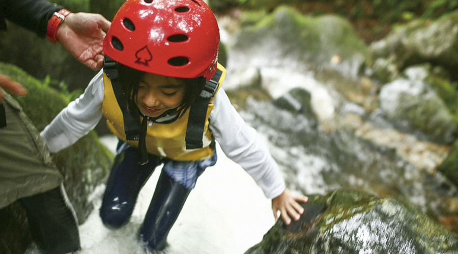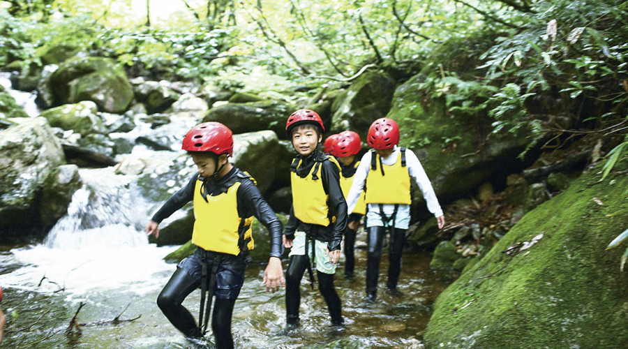 川の水に全身浸かったり、ロープにつかまって斜面を下ったり、急流に逆らって小さな滝を越えたり。リバートレッキングは、最もアクティブな冒険のひとつ。普段は感じられない流れの速さや水音の激しさ、水温約15℃の冷たさをダイレクトに味わいます。協力し合わなければ進めない場所やスリルを感じるシーンもあり、その分、乗り越えた後はひと回り大きく成長するでしょう。安全に対する意識を高め、水を汚すことが他者にどう影響を及ぼすかを想像させます。