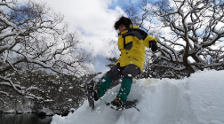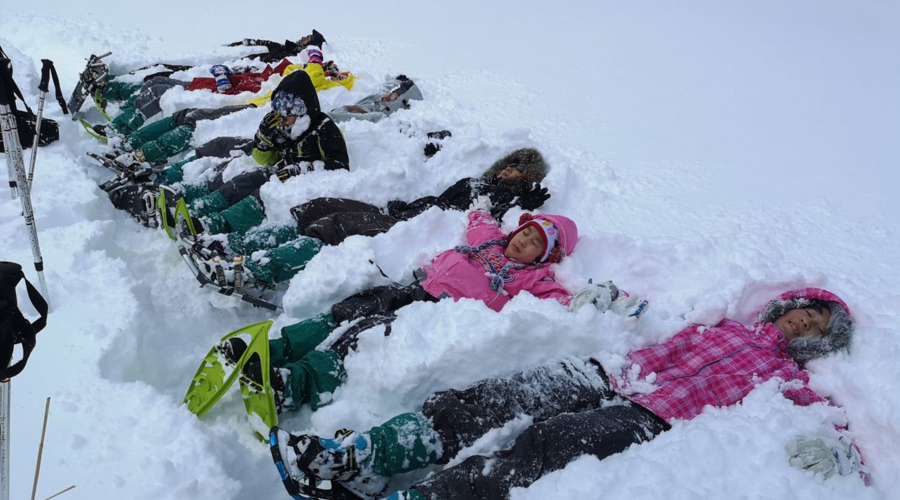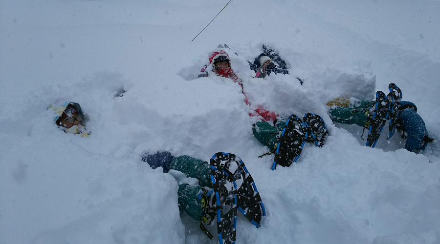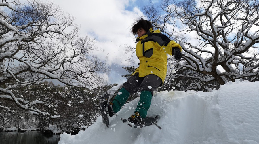 磐梯山エリアは、雪質日本一と言われるパウダースノーが楽しめる土地柄です。スノーシューを履いて雪の上を歩き、見晴らしの良い眺望流山のてっぺんを目指すアクティビティです。雪が積もると、フィールドには見た目以上に劇的な変化が怒っています。例えば、積もった新雪は、2階建ての高さからダイブしてもケガしないほど、ふんわりと体を受け止めてくれます。ルートを見失わないこと、寒さへの対策など防災意識も養います。