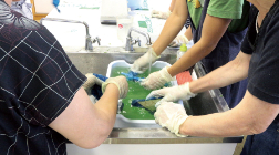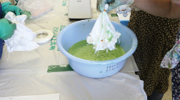 藍染は濃紺のイメージがありますが、生葉染めでは鮮やかな水色に染まります。青汁のような染液に浸した絹布が目の前でみるみる色を変えていく様に、子どもたちは心を踊らせるはずです。体験に使うのは、町で栽培した新鮮な藍の葉と、名水の里の良質な水。体験前後には「なぜ藍で繊維が染まるのか?」を科学的に解説。机上では難解な科学変化も、体験とともに学べば活用できる知識として吸収しやすいものです。